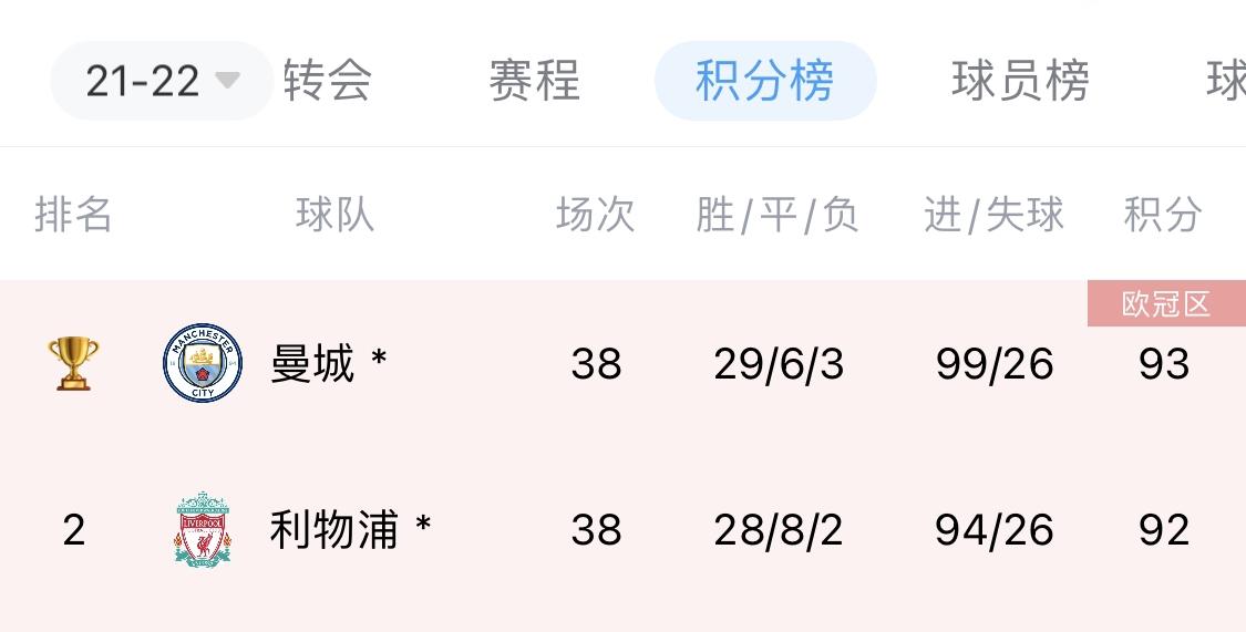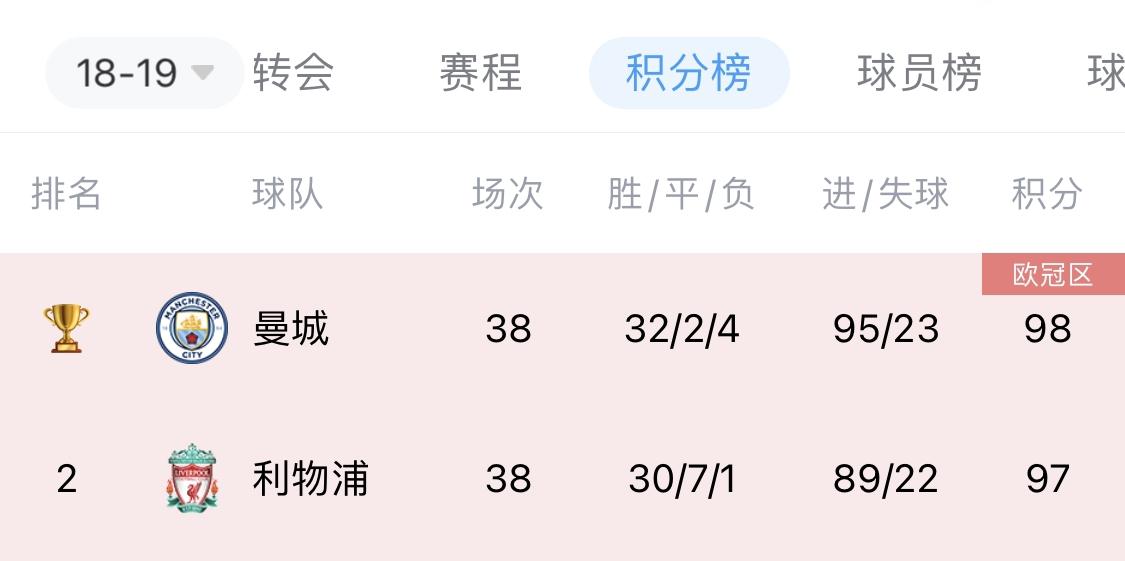 英超末轮曼城4-1客胜布莱顿,利物浦2-0狼队,曼城以98分1分优势力压利物浦夺冠,这是英超首次有两支球队获得90或者90以上的积分,利物浦不幸成为英超历史最高分的亚军