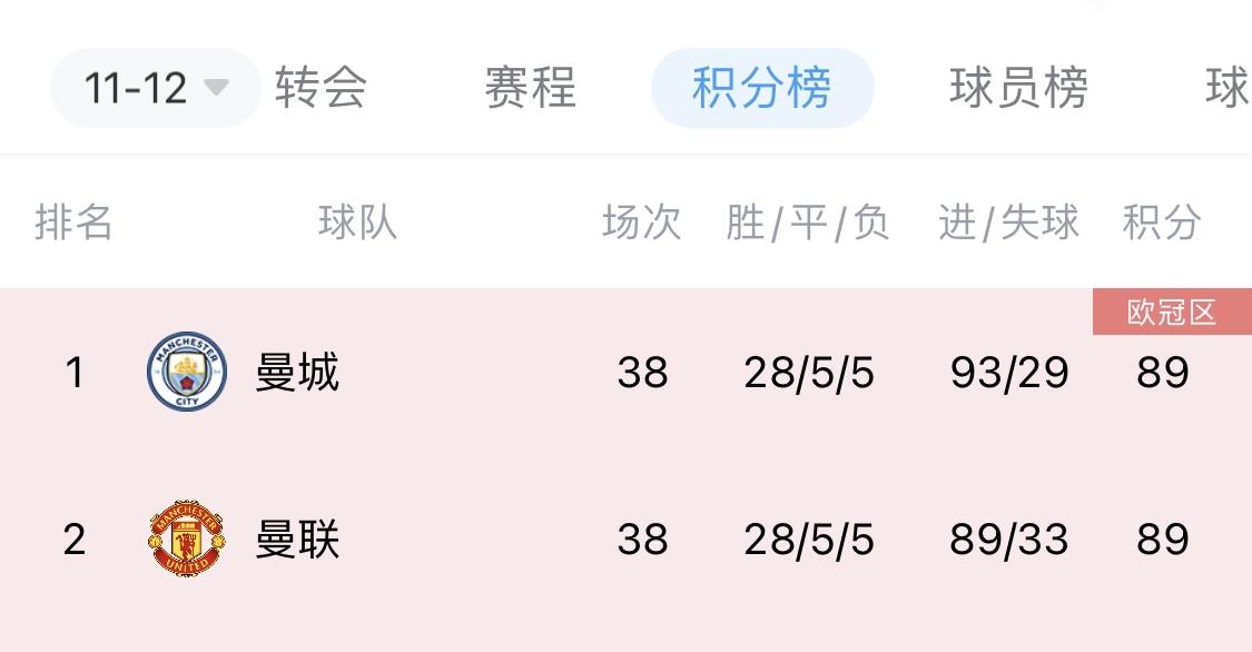夺冠悬念延续到最后一轮,曼城1-2落后情况下补时连入两球,阿圭罗93:20绝杀3-2逆转QPR,和曼联同积89分以净胜球优势力压同城死敌夺冠,这是曼城队史首座英超冠军。