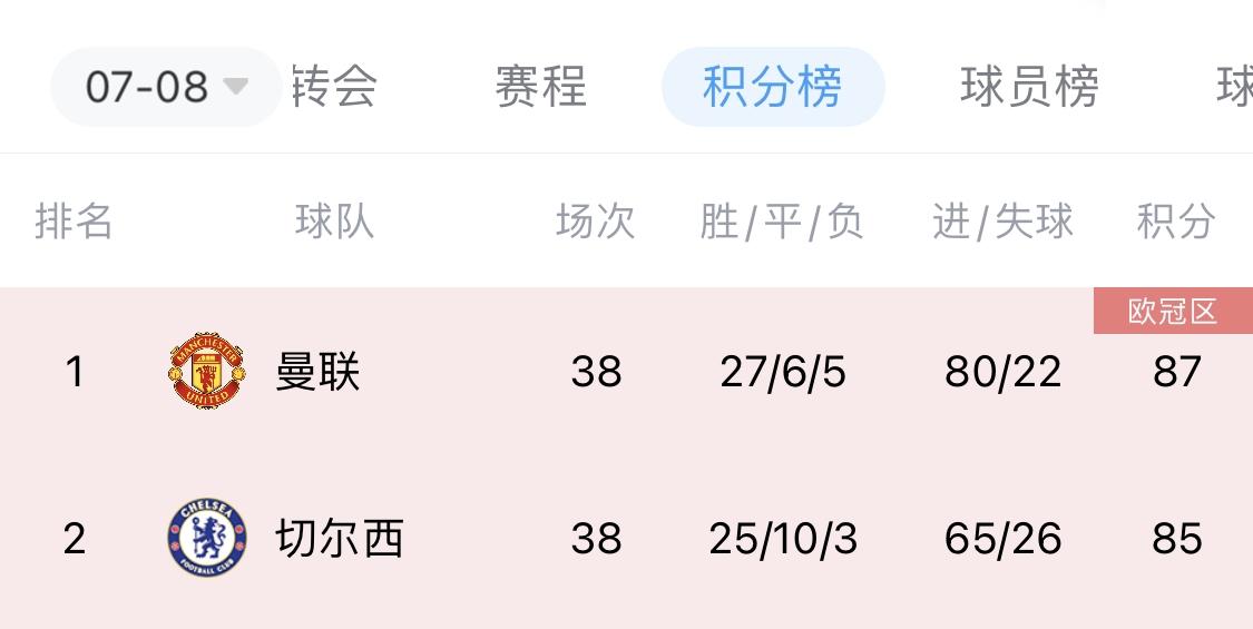 末轮收官战前,切尔西与曼联同积84分。最后一轮曼联2-0客胜维冈,切尔西主场1-1平朴茨茅斯,最终红魔87分卫冕,切尔西85分收官。