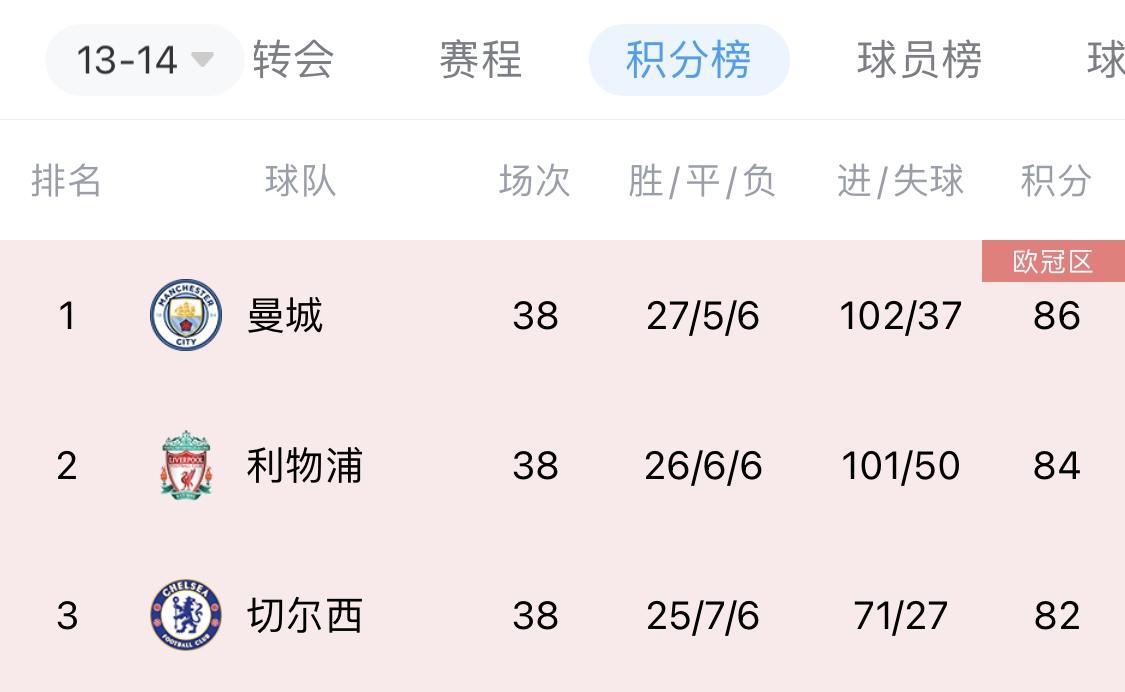 争冠悬念同样延续到最后一轮。联赛结束前2周,利物浦原本占据争冠主动权,却在第36和第37轮一负一平,杰拉德滑倒失误致使红军0-2切尔西、随后又3-3水晶宫。而曼城在2-3不敌利物浦之后的4场比赛保持全胜,最终以86分、2分优势力压利物浦夺冠。