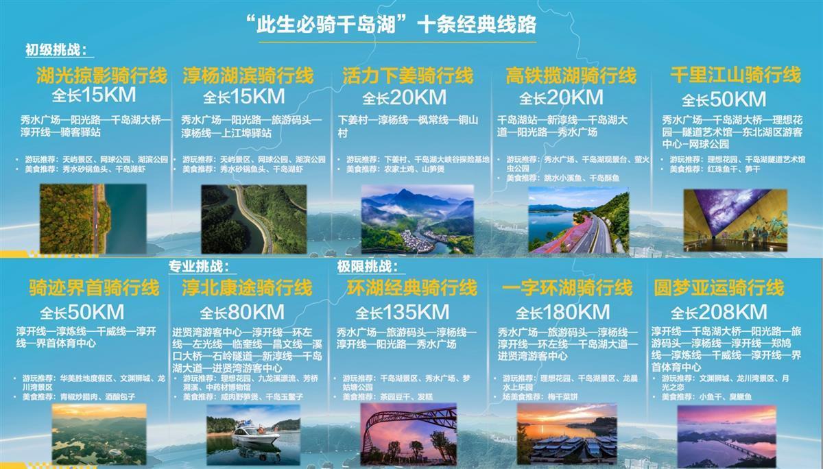 淳安县人民政府副县长姜君介绍,近年来,淳安县充分发挥生态优势,高质量发展体育产业,全力构建自行车、路跑、水上运动为核心的“3+X”赛事体系,培育有环千岛湖公路自行车赛、千岛湖马拉松等一批颇具影响力的赛事。淳安县将深挖体育赛事乘数效应、带动效应和叠加效应,通过夯实设施、举办赛事、招引项目、发展产业等举措,力争将淳安打造成为长三角地区自行车运动天堂、骑行胜地,让此生必骑千岛湖作为新的时尚标签。
