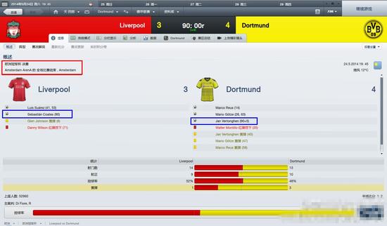 2014年阿姆斯特丹之夜:又是一场经典比赛。笔者的多特蒙德在2:0领先后遭遇重创,中场发动机蒙蒂略染红下场(对你没看错,就是后来去了鲁能那个蒙蒂略)。利物浦当然放不过如此良机,苏神连入两球扳平比分,但我帐下格球王很快将比分再度超出,结果乌拉圭中卫科尔特斯为利物浦在90分钟时再度扳平。当我以为比赛要进入加时赛时,比利时中卫费尔通亨站了出来,在补时第五分钟绝杀对手。