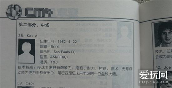 球员推荐手册中的卡卡,连头像都欠奉。由于汉化工作不周全,《CM4》中人名末尾不是英文字母的(比如卡卡词尾的a上带了重读符号)都会与人名后的文本杂糅成一坨乱码。所以卡卡的场上表现基本上靠2D画面猜,文字解说形同虚设。