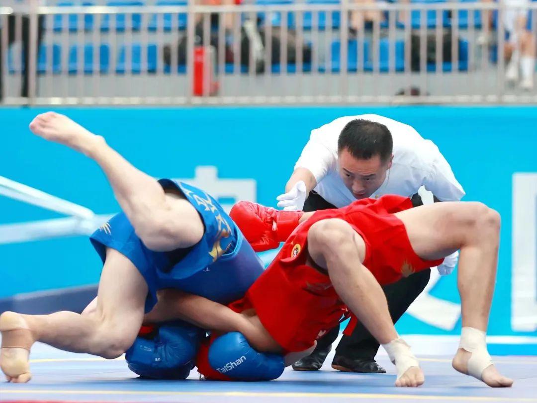 董训、杨青龙的比赛采用散打规则。散打是国粹,是中国武术在擂台上的延伸进化,远踢、近打、贴身摔,形成了最具中国特色的搏击体系。