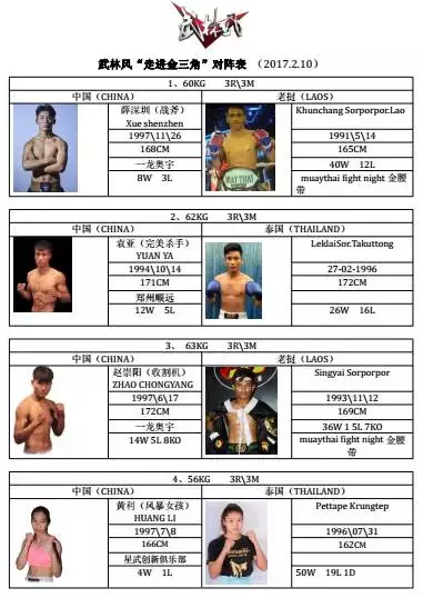 2017年2月10日,应老挝金三角经济特区邀请,武林风将走进这片神秘土地。据了解,金三角当地主办方组织了强大的选手阵容,包括泰国、老挝、柬埔寨等东南亚各国顶尖高手,其中不乏THAI FIGHT 68KG金腰带获得者。