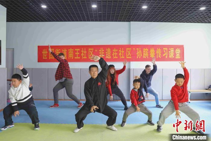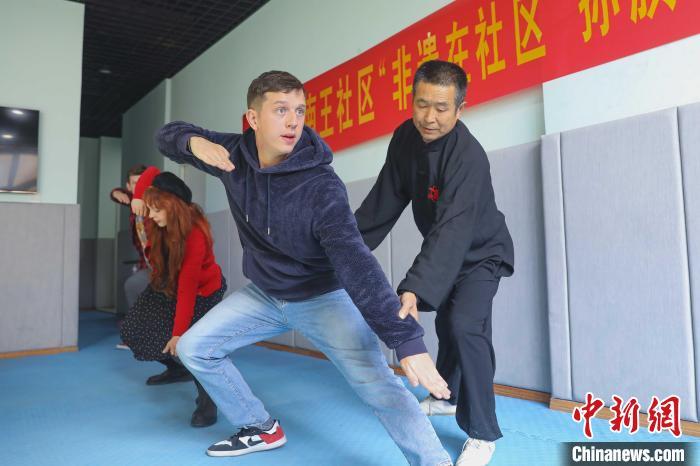 11月11日,来自英国、爱尔兰等国家和地区的外国友人来到山东省青岛市李沧区的一处新时代文明实践站,走进“非遗在社区”孙膑拳传习课堂,体验中国传统武术魅力。