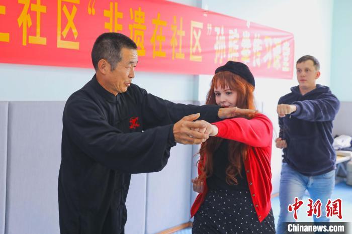 “南王三十二手”非遗传承人指导外国友人的拳法动作。张鹰 摄