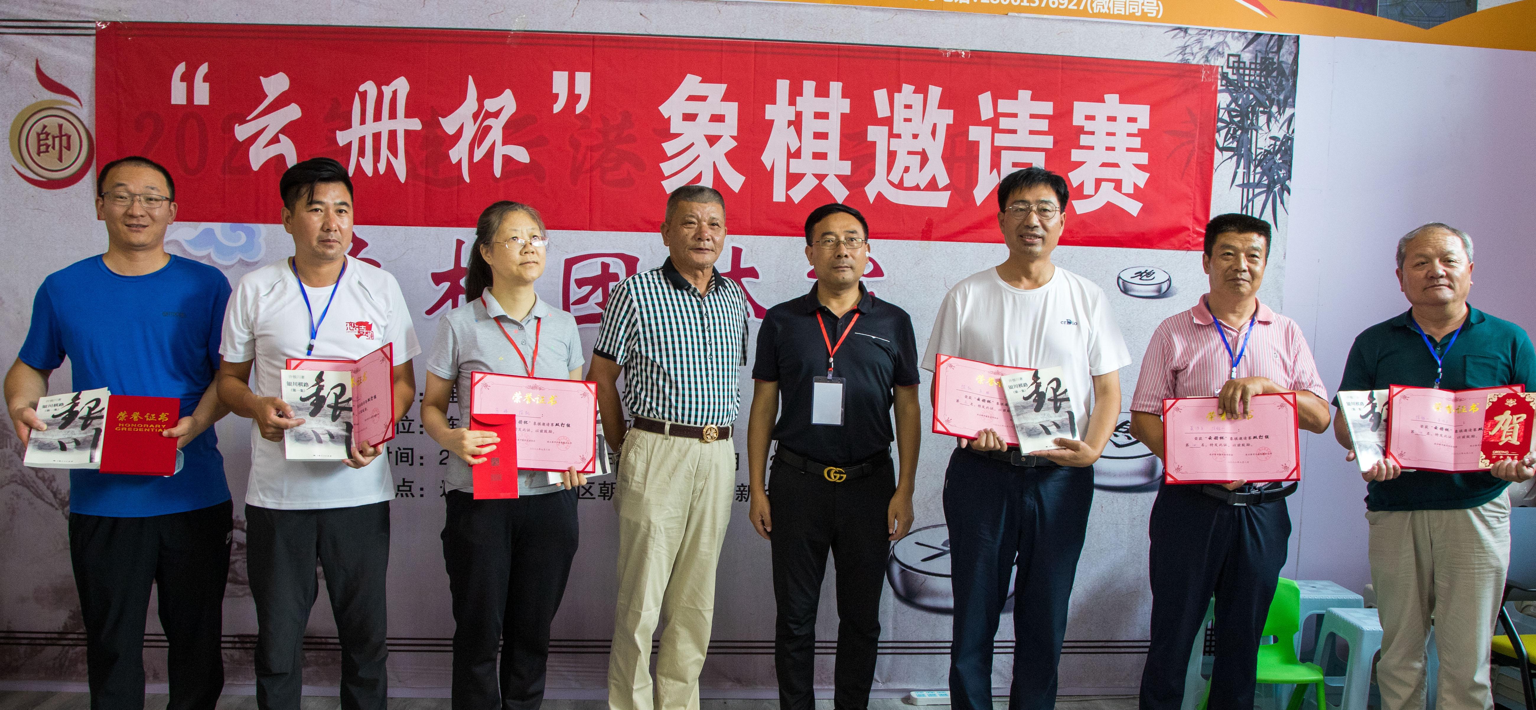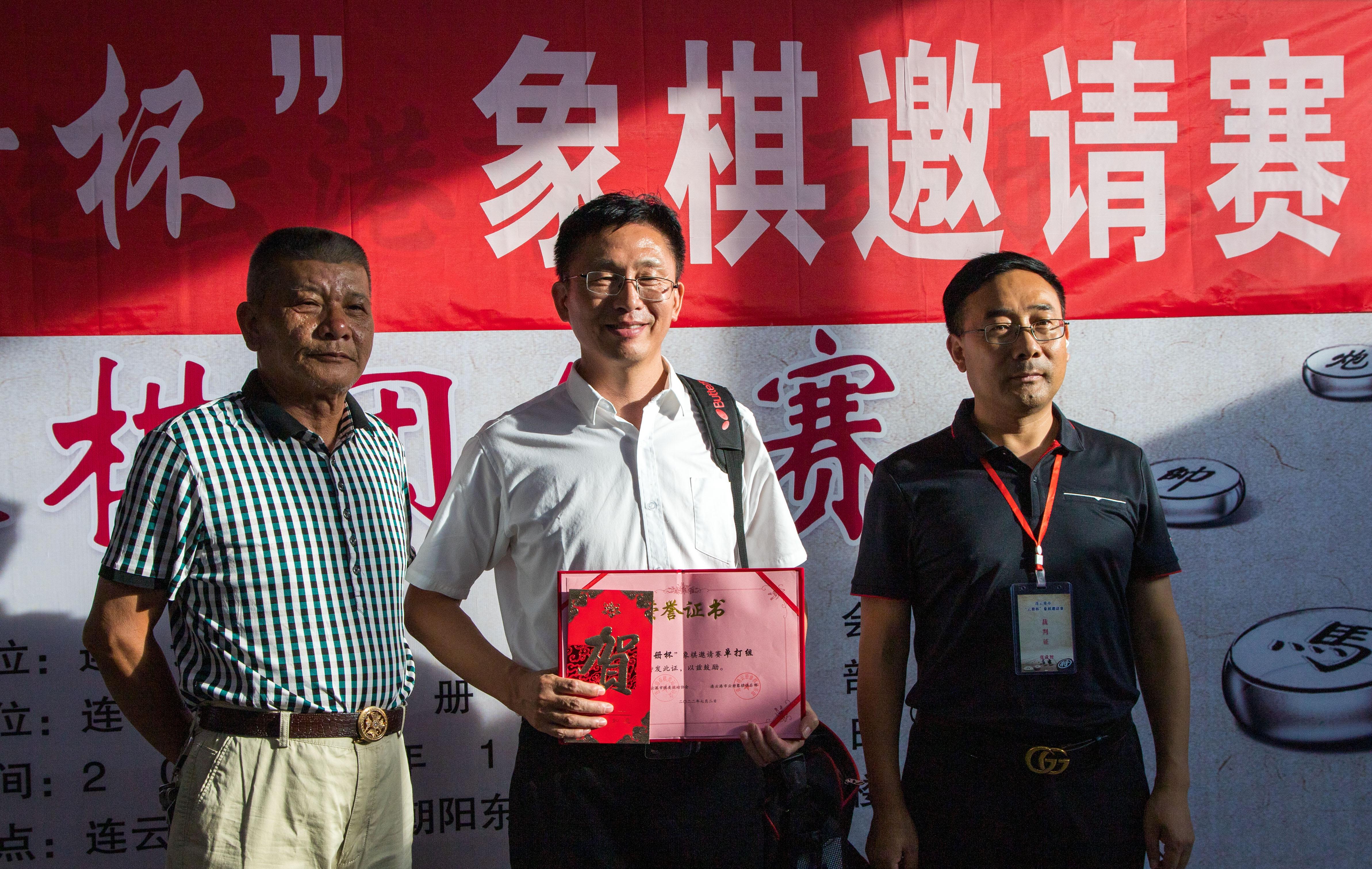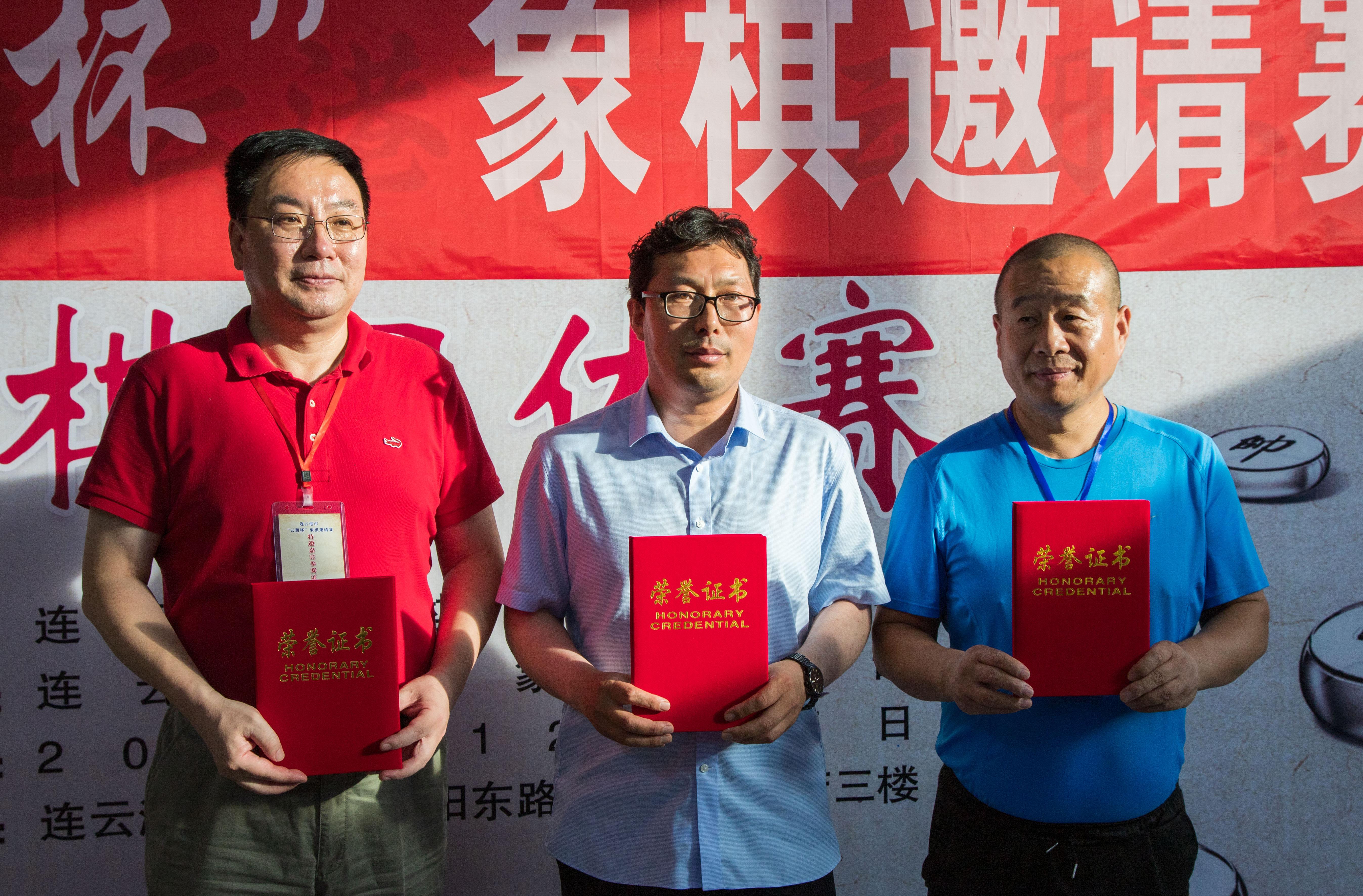 连云港市新华书店总经理侯沛成、连云港市棋类运动协会象棋协会主席张成智、连云港市徐福酒业有限公司董事长孙国银为获奖选手颁奖。