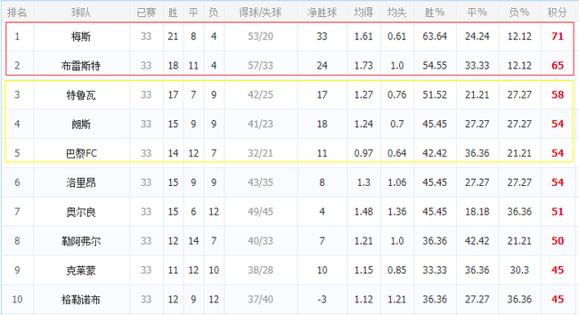 在上周末结束的法乙第33轮比赛中,位列积分榜前4名的梅斯、布雷斯特、特鲁瓦和朗斯均顺利取胜,勒阿弗尔赢下与巴黎FC的实力对决后,与升附区分差缩至4分。洛里昂、奥尔良等争夺升附资格的球队则在本轮遭遇败绩,追赶升附区势头受阻。