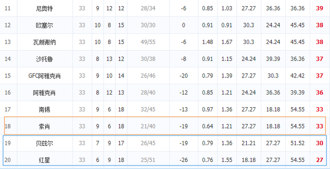 再来看一下积分榜后半区,第11位的尼奥尔至第16位的阿雅克肖仅领先降附区的索肖3-6分优势,虽然在保级形势看似占据主动,但最后5轮联赛彼此之间的对决,无疑场场都是6分之争。值得一提的是,自从16-17赛季降级制度由3个直降变成2个直降+0.5个降附搭配后,保级形势的争夺更加白热化,前2个赛季最后5轮的平局场次分别只有9场和14场,占比率分别只占18%和28%,可见各支球队在冲刺阶段刺刀见红的比拼状态。