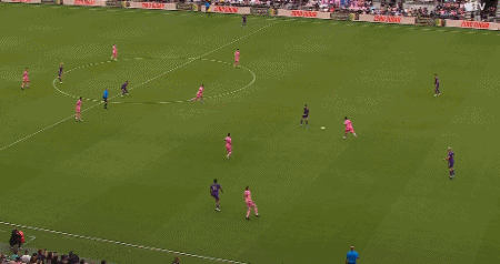 第34分钟,梅西左路拿球被放倒,迈阿密国际获得左路定位球机会,梅西直接打门击中立柱上弹出。↓