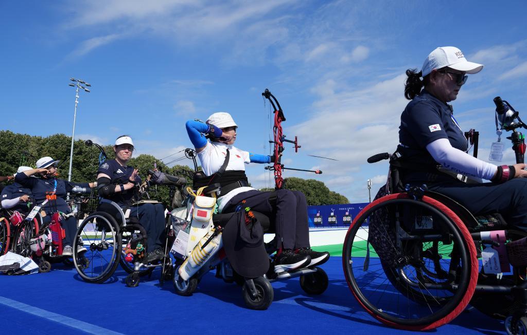 8月24日,巴黎残奥会中国体育代表团射箭运动员刘静(右二)在训练中。新华社记者 才扬 摄