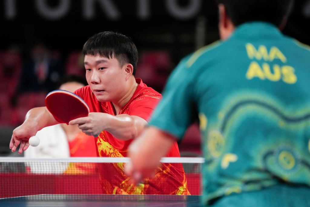 2021年9月3日,中国队选手连浩在东京残奥会乒乓球男子团体9-10级决赛中回球。新华社记者 朱炜 摄