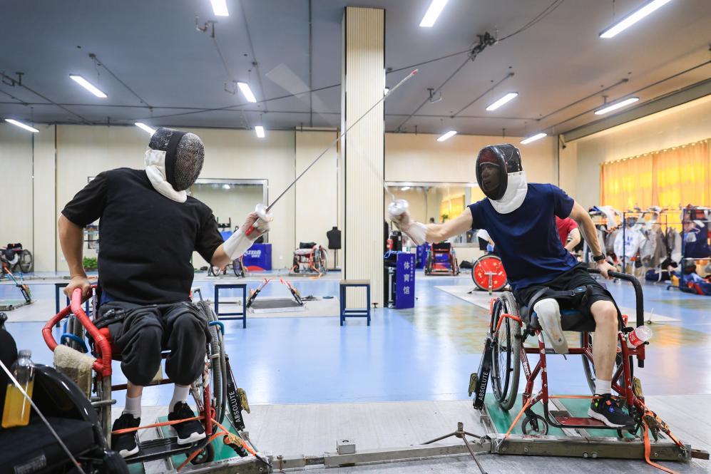 8月12日,中国轮椅击剑集训队(江苏组)运动员胡道亮(左)和仲赛春在训练中。新华社发(苏阳摄)
