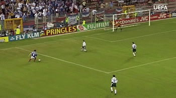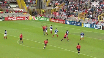 23岁的努诺·戈麦斯再次进球,22岁的蒂埃里·亨利扳平比分。然后,就是那粒著名的“金点球”。第114分钟,特雷泽盖突入禁区,拜亚将球一托,维尔托德小角度抽射击中了沙维尔的手臂!点球!