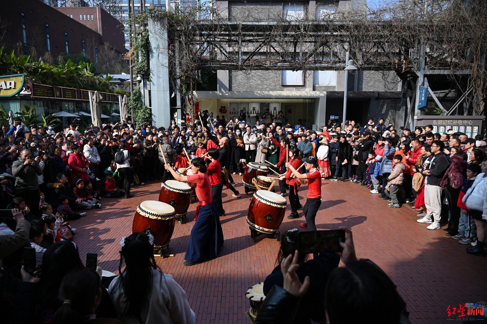 在写有“成都”二字的红墙下,音乐会即将上演,站在中间的鼓手精神抖擞,随着他大喝一声,另几位鼓手随声应下,鼓棒在鲜红的牛皮鼓上敲出隆隆声。鼓点清晰明快,时而急促有力,如爆竹连天;时而轻快悠扬,如春风拂面。现场观众被这欢快的鼓声所感染。