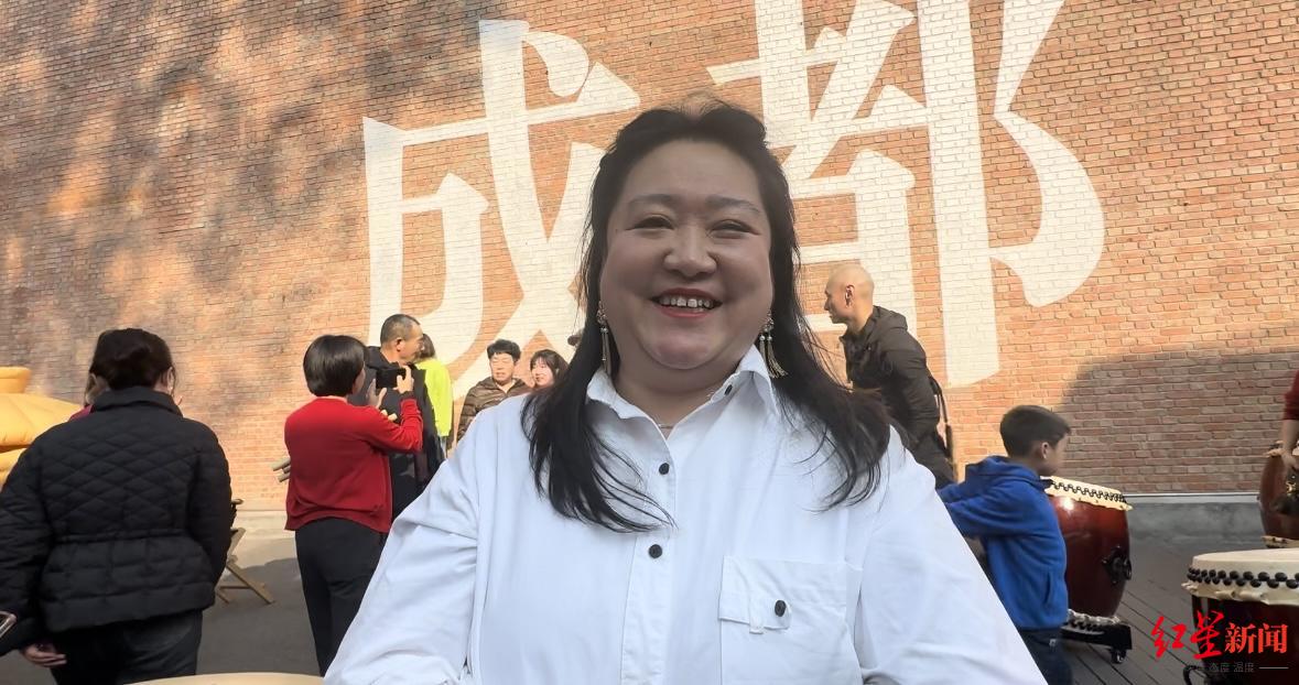 来自哈尔滨的游客邬女士在和鼓手们合影间隙接受了采访,她不住地跟记者表达“成都的过节氛围太好了”。