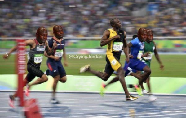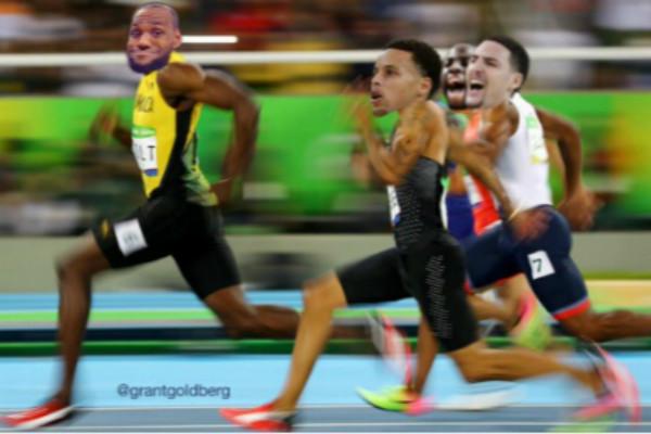 博尔特在百米比赛中领先对手时回眸一笑,有网友把博尔特P成了詹姆斯,后面追赶的运动员P成了库里、汤普森和格林三名勇士球员。