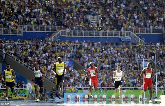 比赛开始,博尔特起步并不占优,但很快便追到了领先位置。后半程,博尔特甚至放慢速度侧头看着旁边的巴林选手费什跑,短短50米,竟然扭了三次头。