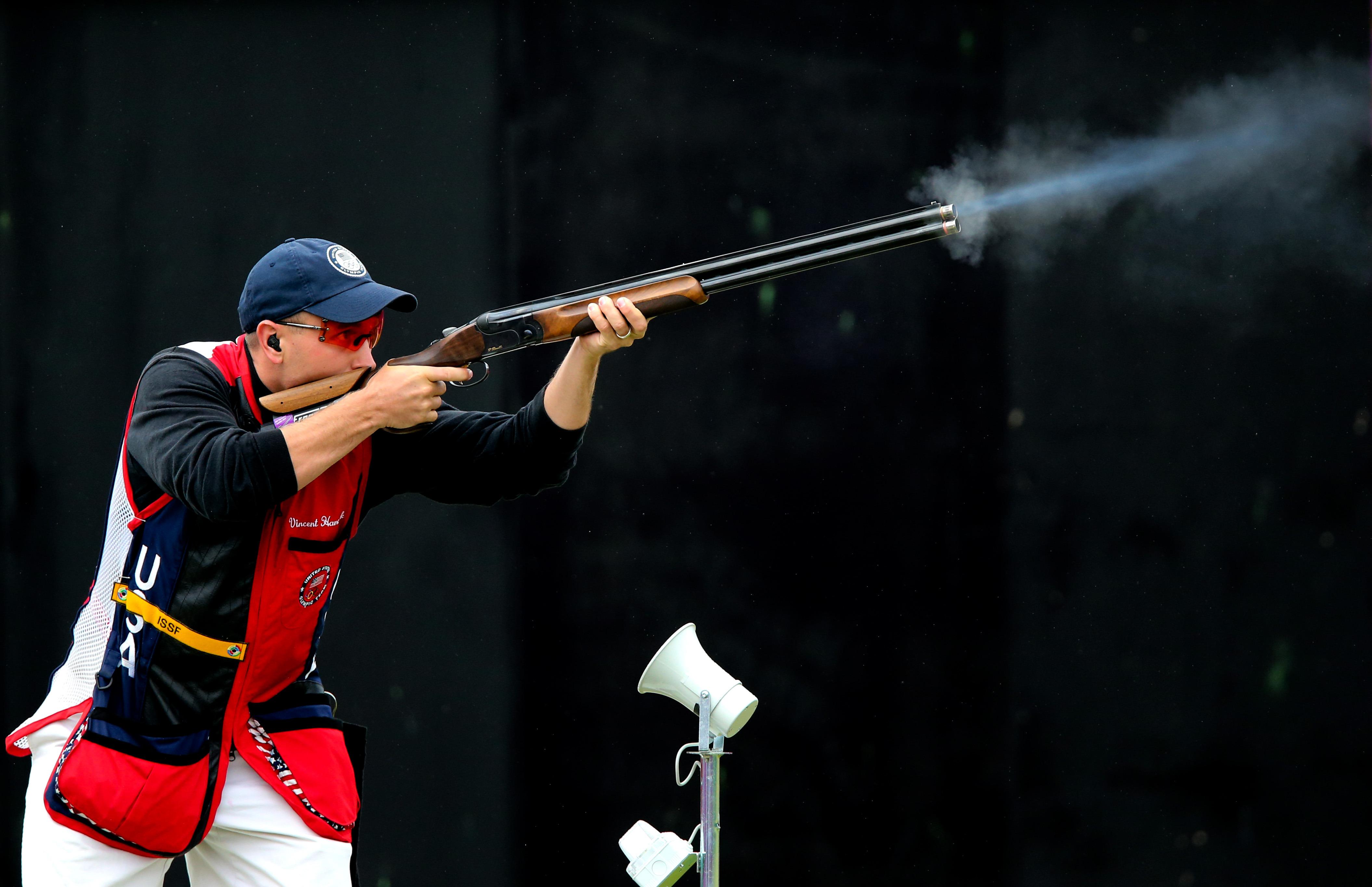 资料图:美国选手汉考克在伦敦奥运会男子飞碟双向决赛中夺冠。新华社记者殷刚摄
