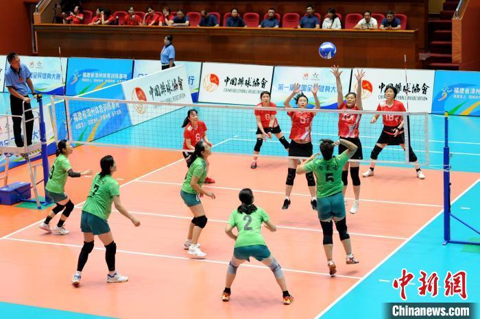 中新网漳州10月12日电 (记者 张金川)12日上午,第一届全国健身大赛总决赛气排球(女子B组)比赛在福建省漳州体育训练基地开赛,来自全国七个大赛区第一名的代表队参加比赛。