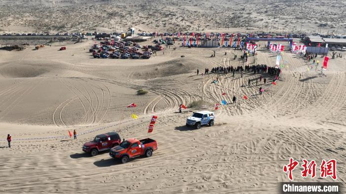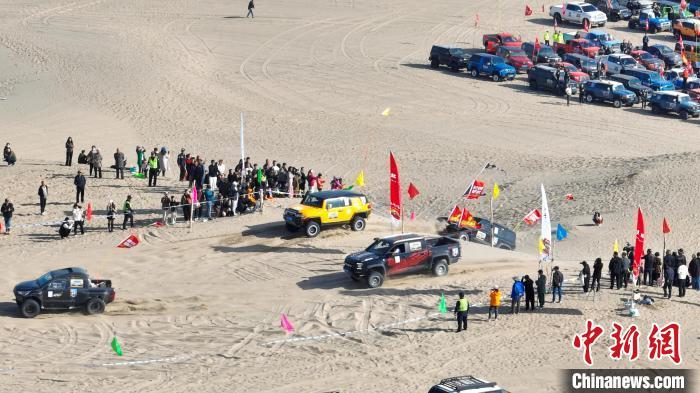 10月26日,2024新疆博斯腾湖“阿诺达”杯沙漠越野争霸赛暨沙行联赛总决赛,在中国最大内陆淡水湖——博斯腾湖湖畔的南山沙漠公园开赛。图为参赛车辆。年磊 摄