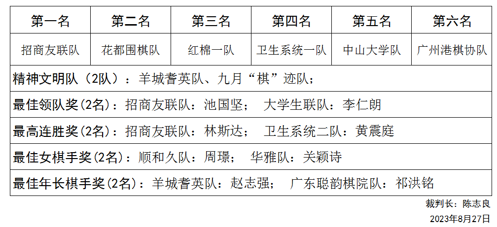 8月27日,由广州市体育局、广州市体育总会主办,广州市围棋协会承办的2023年广州市第十九届体育节“九月-盛远杯”第八届广州市业余围棋团体联赛在广州棋院落下帷幕。方寸棋盘,群雄竞逐,招商友联队在众多实力强大的团队中脱颖而出,成功夺得本年度业余围棋团体联赛的冠军宝座。