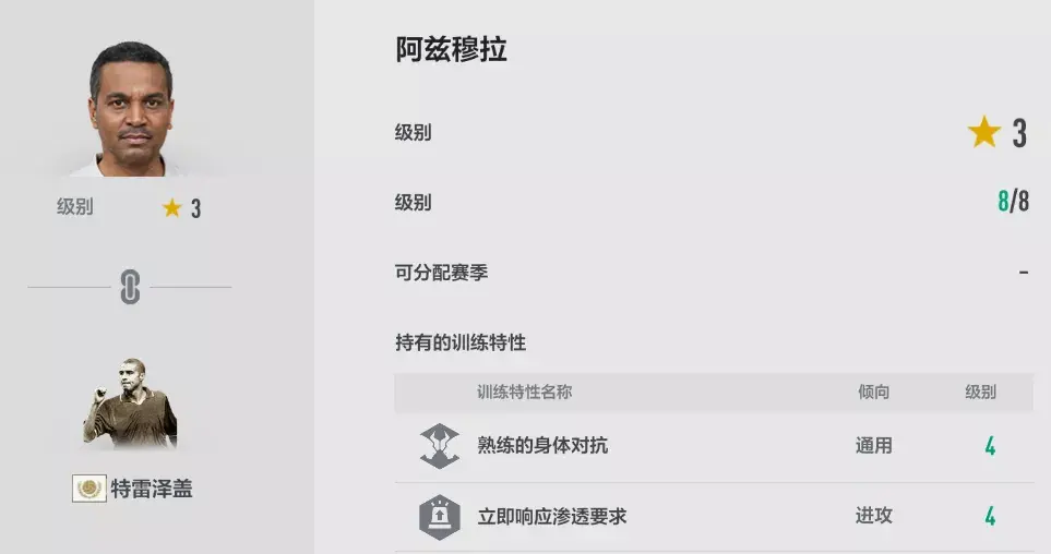 在助教的选择方面,根据上面对特雷泽盖的分析,如果是4星及以下的助教,特性优先建议“熟练的身体对抗”+“立即响应渗透要求” 。前者可以提高特雷泽盖护球和抢点时的稳定性,后者可以让特雷泽盖更快速地前插启动,获得更多单刀机会。