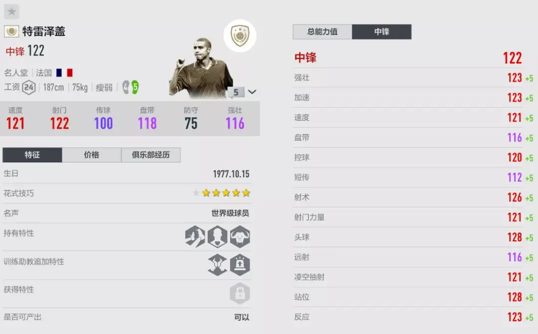 相比于双子星的另一位亨利,特雷泽盖在中前场的控球和传球都有所不如,游戏里ICON特雷泽盖也是标准的箭头式中锋。不过如果对方的防守出现空当,那么“盖子”回撤接应后也可以尝试送出一些短距离的直塞球;在没有被包夹的情况下,基本的二过一以及横向转移等短传,特雷泽盖也是能够较为精准地做到。