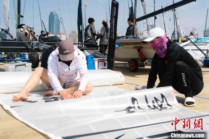 选手在整理船帆。 臧鲁敏 摄