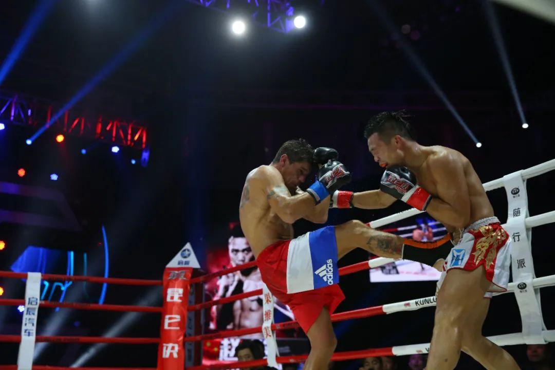 年轻15岁的李壮壮敢于出招,第二回合他接连使出飞膝和高扫等大幅度、强杀伤的技法,不过收效甚微。后面的比赛延续了上一回合的节奏,克劳斯在自己的最强领域拳法上逐渐发挥威力,轰向头部、腹部的重拳令李壮壮疲于招架,其中一记击腹勾拳让李壮壮面露痛苦,显然是遭到了重创。最后时刻,克劳斯一记压哨重拳险些将李壮壮击倒。