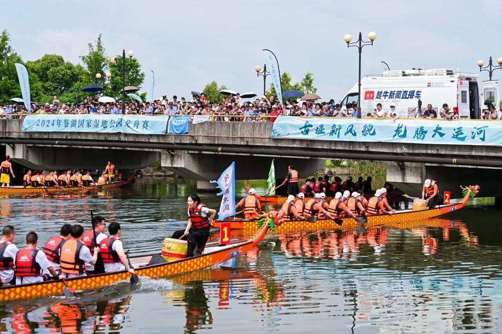 新华社客户端浙江频道6月8日电(记者夏亮)龙腾运河展新风,陶堰竞舟庆端午。8日,2024年鉴湖国家湿地公园运河龙舟赛在萧曹运河上举行,活动旨在以传统习俗为媒,以体育竞技为桥,为乡村赋能。