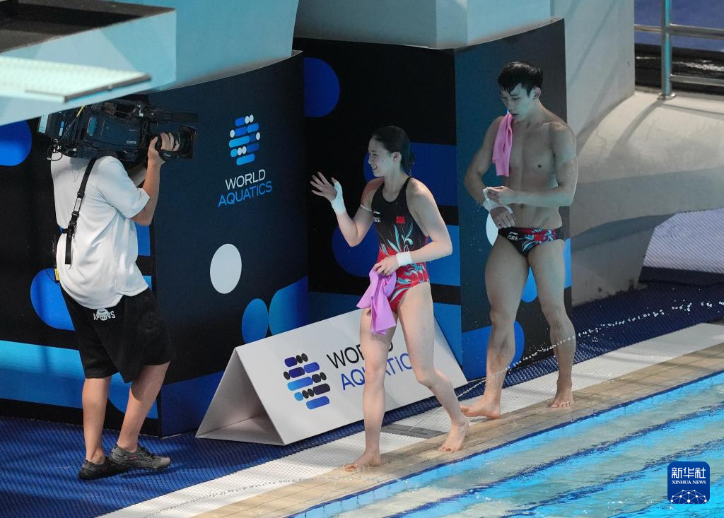 4月19日,陈芋汐(左)/杨昊在混合十米台比赛后。
