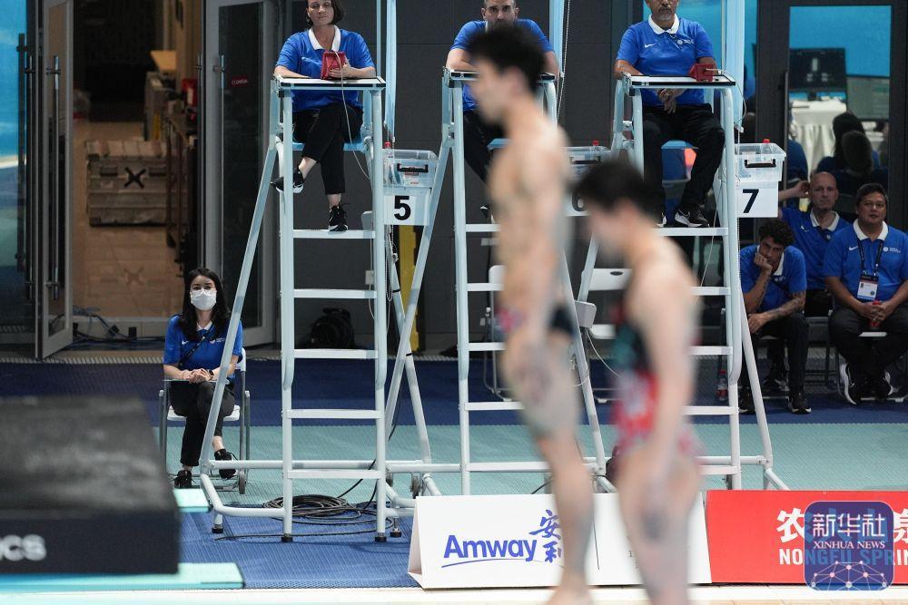 4月19日,世界泳联跳水技术委员会委员郭晶晶(左一)在场边观赛。