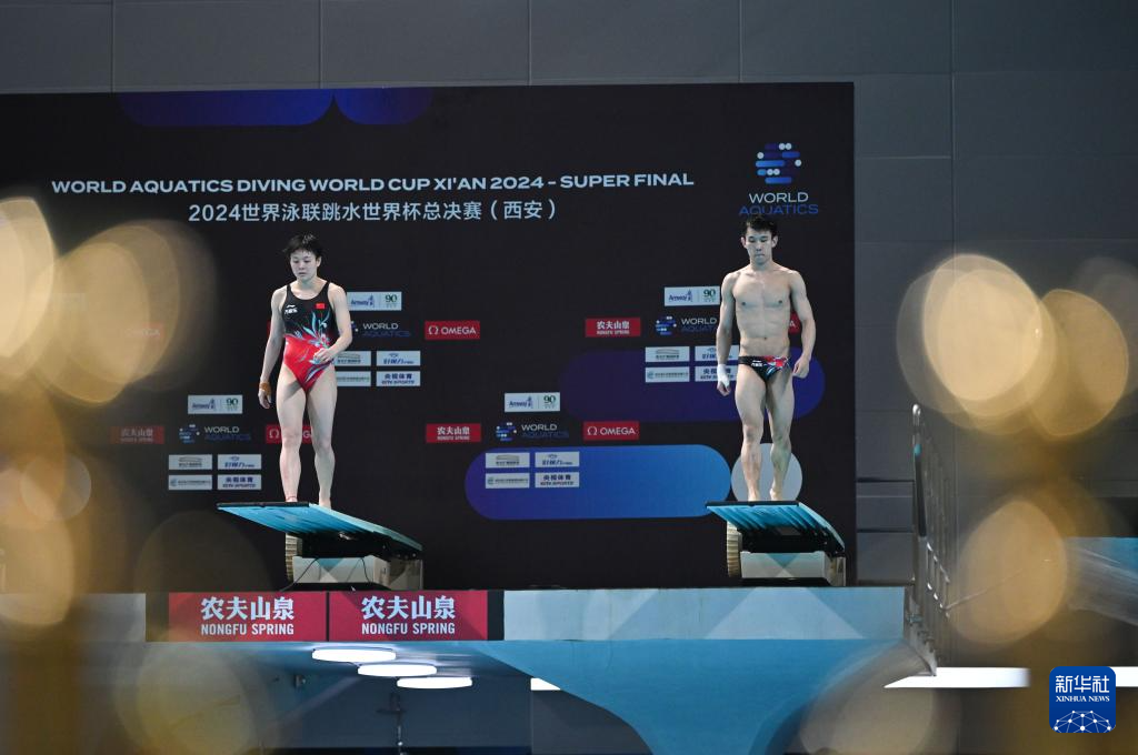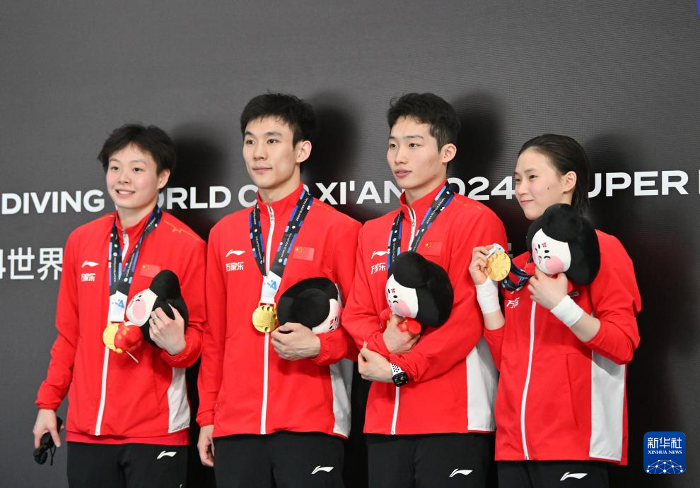 当日,在陕西西安举行的2024年跳水世界杯总决赛混合团体决赛中,由杨昊、陈芋汐、陈艺文、王宗源组成的中国队以500.75分的总成绩夺得冠军。