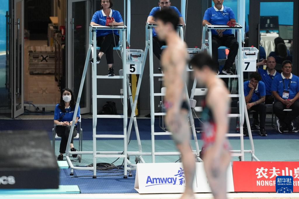 ↑陈艺文(左)/杨昊在混合三米板比赛中。新华社记者 张博文 摄