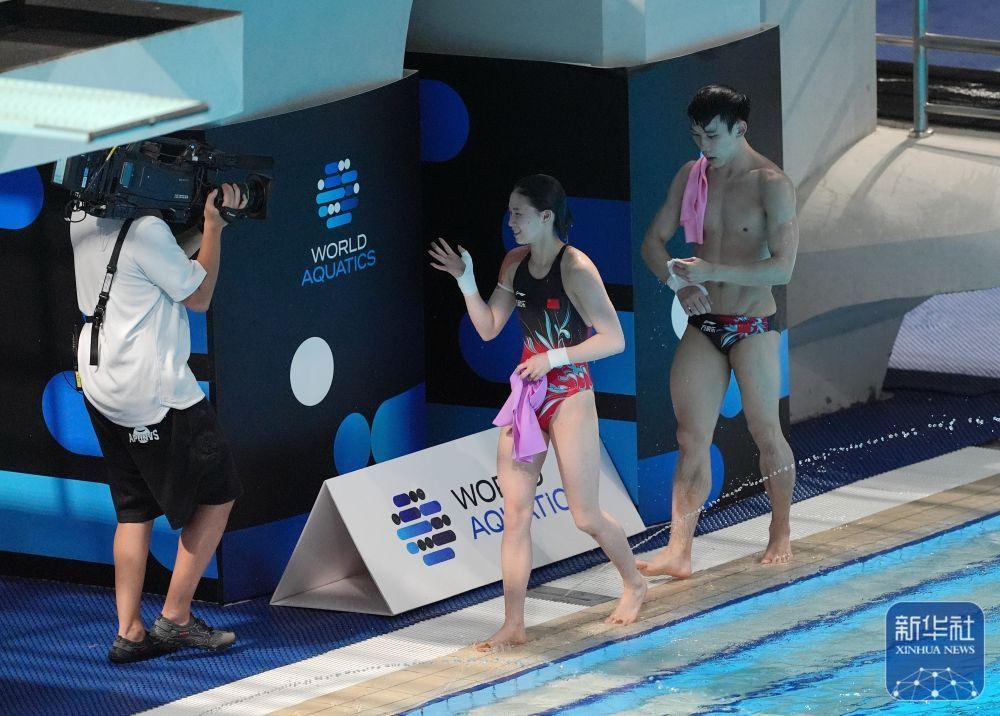 ↑陈芋汐(左)/杨昊在混合十米台比赛后。新华社记者 李一博 摄