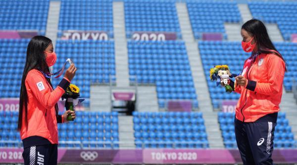 8月4日,日本选手开心那(左)和四十住樱在东京奥运会滑板女子公园赛颁奖仪式上。新华社记者李尕摄