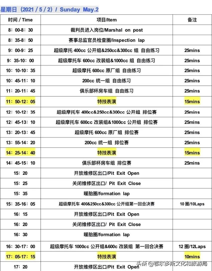 比赛间隙有精彩的文艺演出、美食大赏、改装车展示及大嗓门、钻杆挑战赛、摩托车金卡纳挑战赛、汽车展览 等环节。