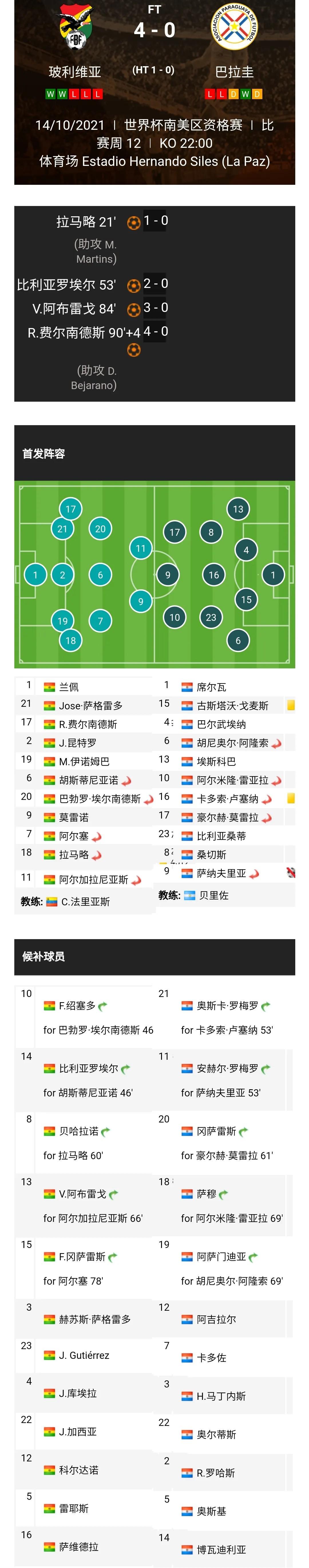 北京时间10月15日凌晨,2022年世界杯预选赛南美区第十二比赛,“高原雄鹰”玻利维亚队在首都拉巴斯海拔3640米的费尔南多.西莱斯体育场迎战巴拉圭队。本场比赛主场比赛的玻利维亚队充分利用了他们高原主场的优势,控制比赛节奏,并通过远射频频威胁巴拉圭队的球门。21 分钟玻利维亚队前锋罗德里戈·拉马洛在禁区的月牙形抢断成功,将球截走顺势射门,巴拉圭门将安东尼.席尔瓦措手不及,主队获得领先。第26分玻利维亚队的何塞·萨格雷多在禁区内手球被主裁判判罚点球,但效力于意甲都灵队的巴拉圭前锋安东尼奥·萨纳布里亚却将点球踢飞,错失绝好扳平比分机会。半场结束前巴拉圭队还有几次有威胁的射门都被玻利维亚队门将卡洛斯.兰佩化解了。第53分钟玻利维亚队的中锋莫雷诺射门被扑出,替补出场的中场球员比利亚罗埃尔禁区补射入网,玻利维亚队将比分领先优势扩大为两球。随后莫雷诺还一记漂亮的射门被巴拉圭队门将安东尼.席尔瓦扑出。随着比赛的进行巴拉圭队球员体能显出疲态,而玻利维亚队则越战越勇。第84分钟玻利维亚队替补前锋V.阿布雷戈攻破巴拉圭队球门,将比分改写成三比零。全场伤停补时第四分钟,玻利维亚队的左边后卫R.费尔南德斯锦上添花为主队攻入一球。最终玻利维亚在高原主场4:0狂胜巴拉圭队,取得预选赛的两连胜。在积分榜上,玻利维亚队和巴拉圭队同积12分且净胜球同为-8个,玻利维亚队凭借进球数多的微弱优势超越巴拉圭队排到积分榜第6位。