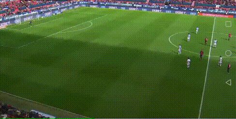 如上动图所示,这是奥萨苏纳队面对西班牙人队时在西班牙人队的右边路完成的一次叠瓦式跑位战术。三名球员快速而又准确的传递,瞬间撕破了西班牙人队在右路严密的防线,后场的防守变得七零八落,盯人出现了混乱,防守职责与站位也变得愈发模糊。