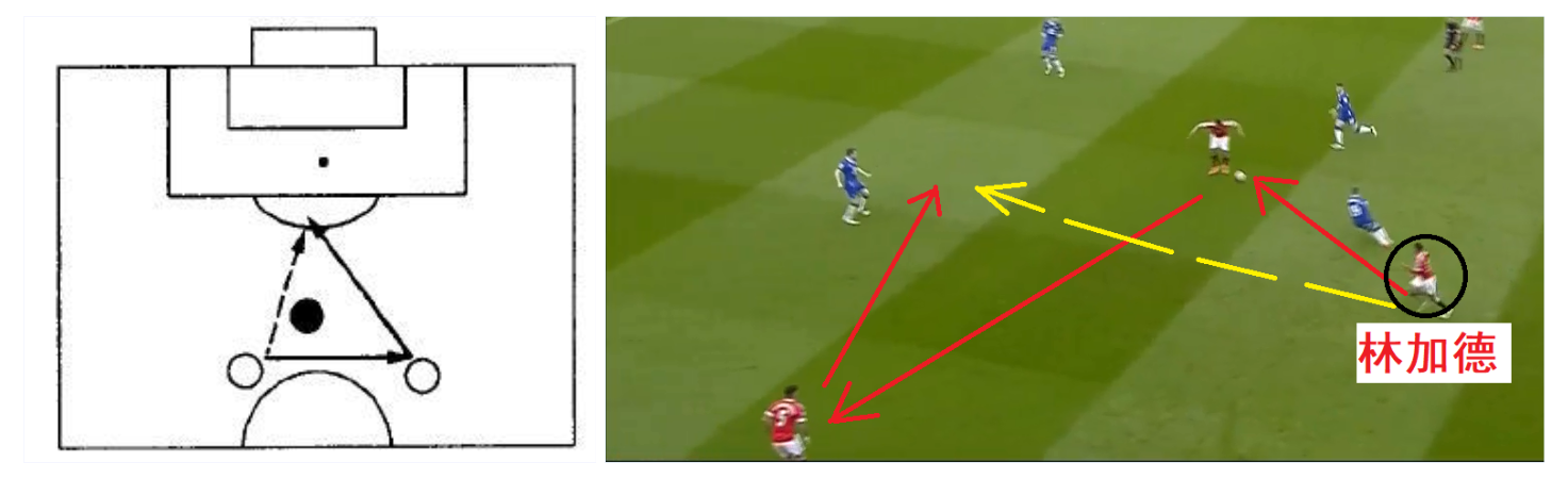 左图为2过1战术配合;右图为叠瓦式跑位战术