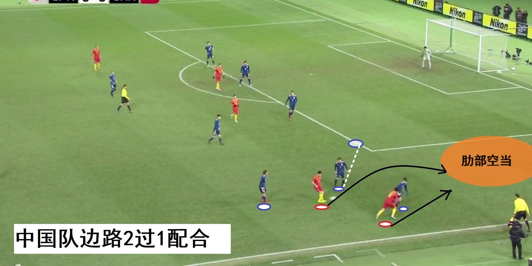 这样一来,中国队就可以充分利用日本队左中卫出来之后在他身后的边肋空当,完成传中。而进行跑位的球员傅欢,也正是跑向这一区域。虽然日本队的翼卫已经察觉到傅欢要启动加速了,但是因为傅欢早已与传球队员比划过手势,心有灵犀。所以傅欢还是抢占了先机,以速度和身体对抗优势在空当区域完成了漂亮的传中。