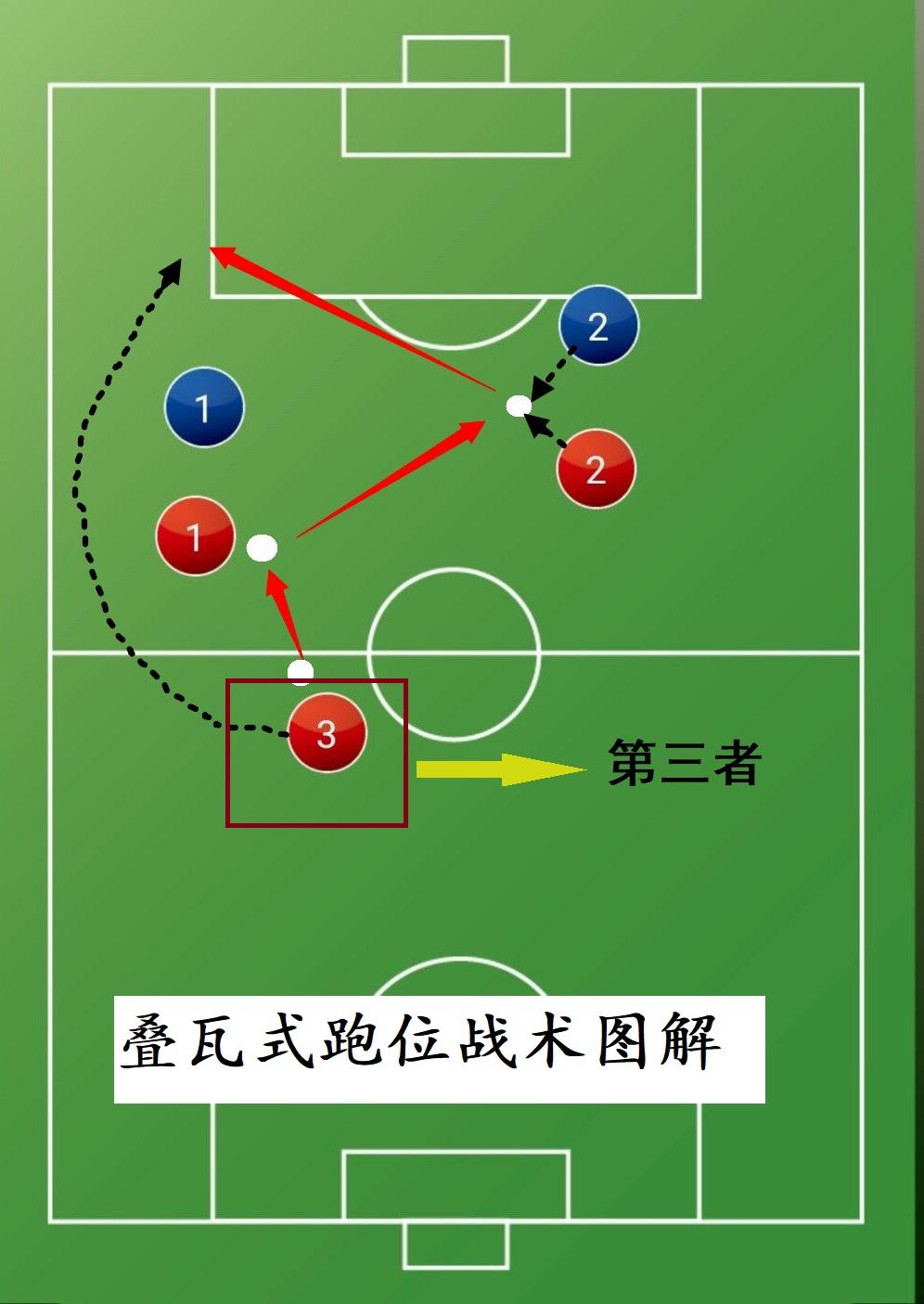 叠瓦式跑位战术又叫做“第三者”跑位战术说起叠瓦式跑位战术,相信大家还对这个叫法有所陌生,但是说起“第三者”跑位战术,大家应该在我之前的文章里都有所了解,实际上叠瓦式跑位与第三者跑位二者是同一个道理。