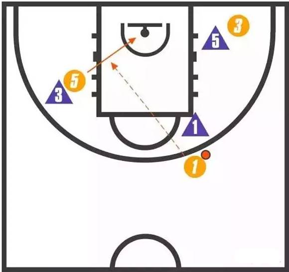 如果③ 启动之后防守球员1 补防到位,那么接下来的衍生战术便能生效,③ 带走防守球员1 ,① 直接切入篮下,② 及时将球送到篮下,① 便能轻松得分。