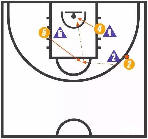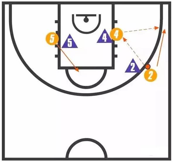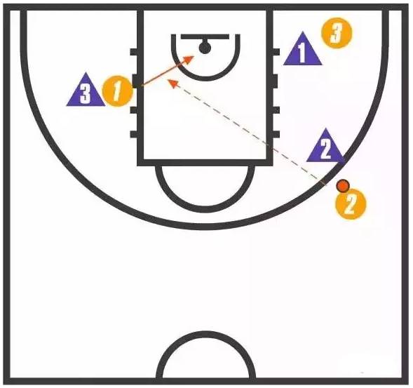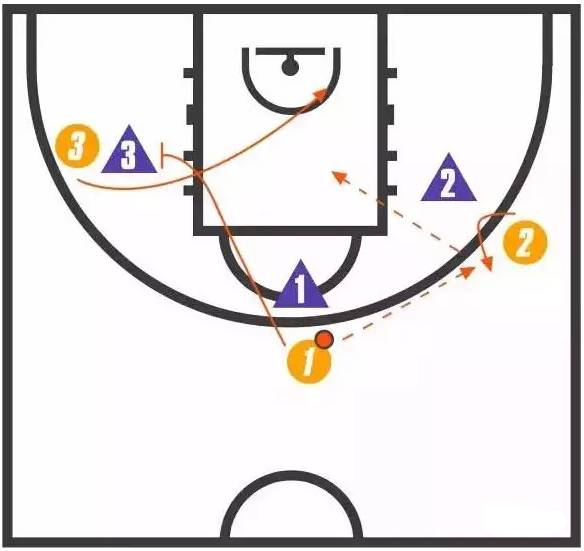 这个掩护与之前的“掩护变化”战术有异曲同工之处,所不同的是这套战术是依靠② 和③ 的切入得分能力。② 给③ 做下掩护,③ 绕掩护卷切入篮下,若防守球员2 没跟防,① 直传③ 上篮得分;