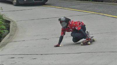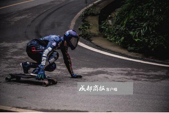 5月3日上午8点,挑战开始,整个山路上只剩下他和一辆后勤保卫车。卿运辉戴好头盔,踩在长板上,朝着山下一路下滑,路过急弯,卿运辉缓缓降低重心,手套中滑板擦着地面,冒着火花。10.77公里,落差1100米,他不能有半点马虎,眼睛死死盯着前方。