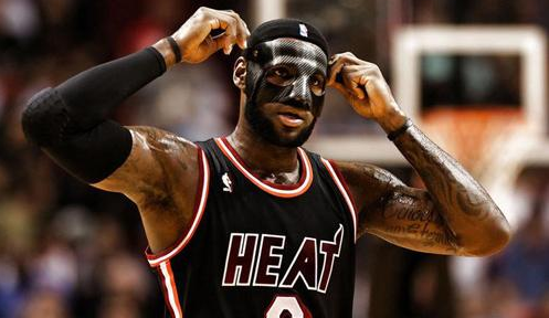 14年2月28日对阵尼克斯的比赛中,詹姆斯没有因为上一场比赛面部受伤缺席比赛,在赛前就有媒体预测詹姆斯将佩戴面具出场,结果詹姆斯没有选择传统透明面具,而是戴上别出心裁的黑色面具。詹姆斯佩戴黑色面具十分霸气,犹如帝王君临天下一般。赛后亚马逊平台上詹姆斯同款面具十分火爆,遗憾的是,仅仅一场比赛后,联盟便要求詹姆斯更换面具。