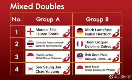 混双方面,埃利斯/史密斯、德差波/沙西丽、乔丹/梅拉蒂、徐承宰/蔡侑玎进入A组,拉姆斯福斯、吉凯尔/德尔吕、吴顺发/赖洁敏、费萨尔/维德佳佳进入B组。(完)