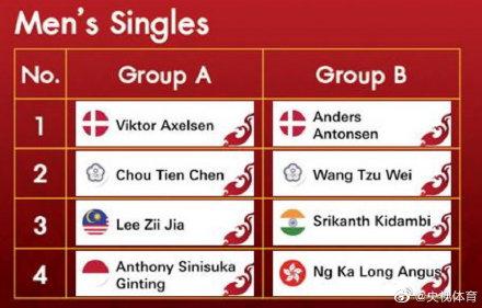 男单方面,安赛龙、周天成和金庭三位顶尖高手被分到“死亡小组”A组,此外本组还有李梓嘉。安东森、王子维、斯里坎特和伍家朗被分入B组。